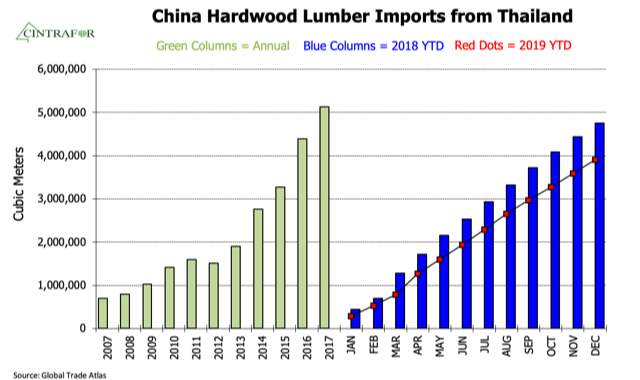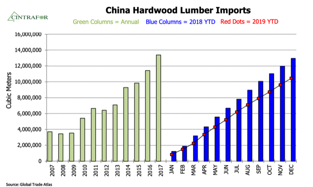 - China’s hardwood lumber imports dropped 20% but U.S. hardwood lumber exports to China were down 39%, nearly twice as much.
