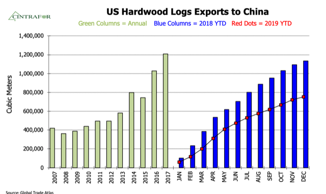 - China’s hardwood log imports dropped 19% while U.S. hardwood log exports to China fell 34%.